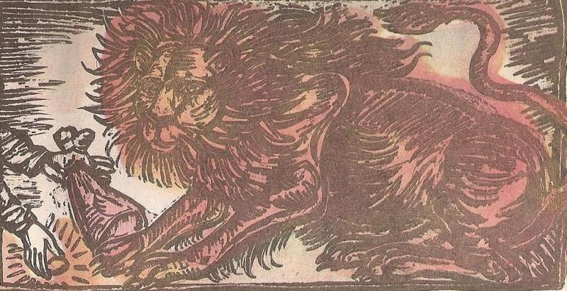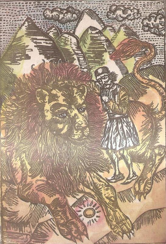 Подир време, като се привършили камъните на онова място, тръгнал да дири другаде по-надалечко. Тук-там, тук-там, навлязъл в един гъсталак и що да види: на няколко крачки отпреде му лежи връз една плоча и се припича на слънце голям лъв. От страх сиромахът се схванал — ни напред, ни назад. Царят на животните, щом го усетил, понадигнал се, изгледал го — разбрал, че човекът не само не смята да го напада, ами много се бои от него, и пак си легнал. Пък каменарят, като видял, че лъвът е такъв хрисим, събрал храброст в сърцето си и направил две-три крачки напред. Лъвът пак се поизправил, поогледал нечакания гостенин и отново се изтегнал.