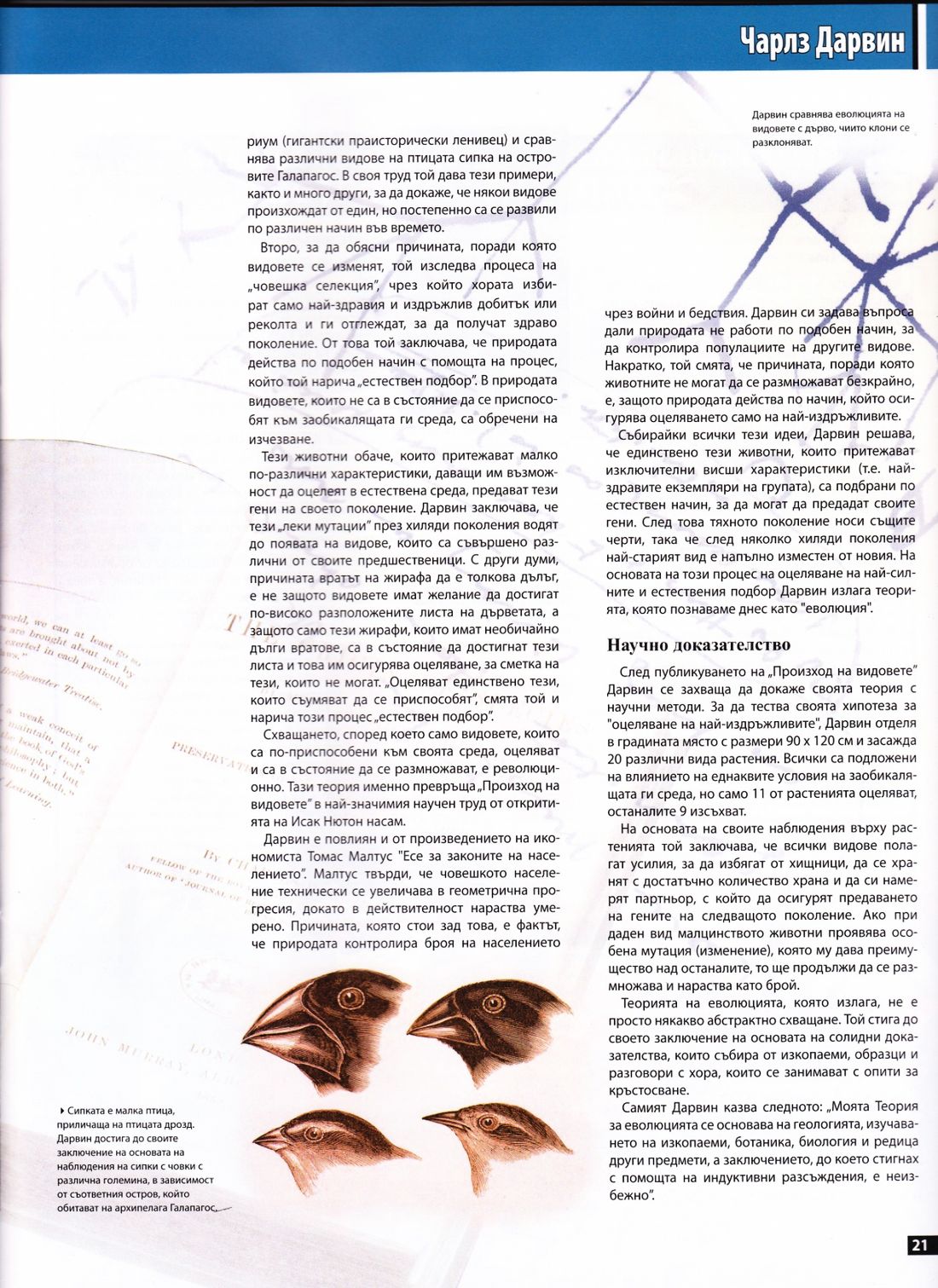 Пътувайки с кораба „Бийгъл“, Дарвин прави петгодишно околосветско пътешествие със спирка на островите Галапагос, където забелязва, че животинските видове се различават на отделните острови, което го довежда до хипотезата за еволюцията. Впоследствие той публикува своя труд „Произход на видовете“ — спорна книга, която с помощта на научни методи и доказателства оборва идеята, че всички видове са създадени от божествена сила и се превръща в най-великото откритие след откритието на Нютон за гравитацията.