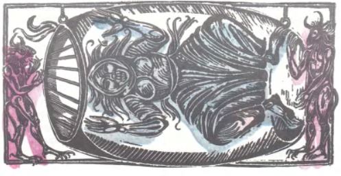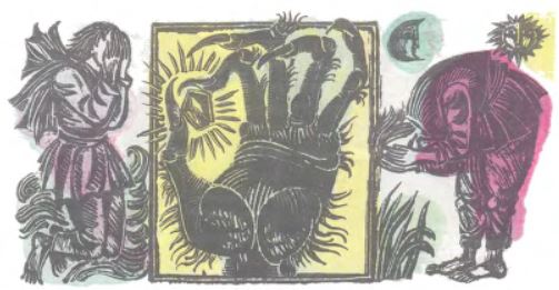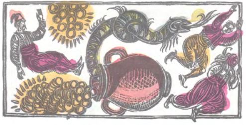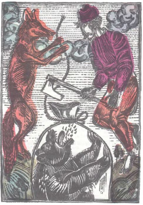 — Ха сега — викнала лисицата, — вържи чувала с едно въже отгоре… Върза ли го? Сега грабни секирата и удари тоя пън яката.