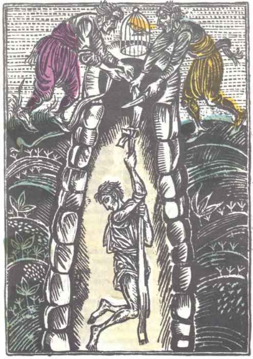 Мислил Силян, мислил, дали да им се покаже, или да побегне назад: „Ох, клетият аз — рекъл си на ум той, — къде изпаднах: горе — високо, долу — дълбоко. Да се върна, в коя дупка ще се крия? Пък ако се покажа, дали тези няма да ме убият и изядат, че де да зная — може да съм слезнал в долната земя при дивите люде? Ама аз и така съм загубен, ще им се покажа, пък каквото ще да става“.