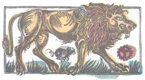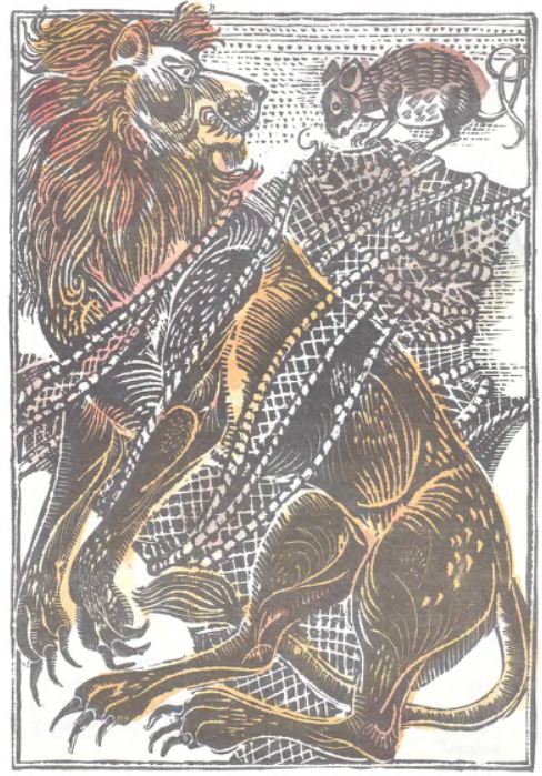 — Не виждаш ли как съм се омотал в тая проклета мрежа? — изръмжал запъхтян лъвът. — Подир малко ще дойдат ловците. Ще ме вържат с железни синджири и ще тръгнат да ме развеждат по градове и паланки, да ме задяват децата и да ме мъчат хората. Аз изхабих всичката си сила и не можах да се отърва от въжетата, та ти ли, нищожно мъниче, ще ми помогнеш?