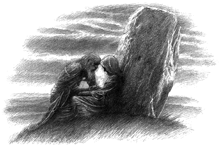 Ала Хурин не отговорил, само седнал до камъка с Морвен в прегръдките си; и повече не изрекли ни дума; а когато слънцето залязло, Морвен въздъхнала, стиснала здраво ръката му и се отпуснала неподвижно; и Хурин разбрал, че е мъртва.