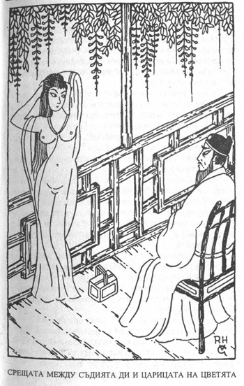 — Не е много ласкателно — обади се пришълката. Гласът й бе приятен и възпитан. Тя се наведе, за да мине под завесата от глицинии, и съдията забеляза неголяма пролука в парапета. Може би там имаше някакви стъпала към пътеката, която обикаляше хотела. Когато младата жена се приближи, съдията бе смаян от поразителната й красота. Овалното лице с изящен нос и големи изразителни очи бе наистина пленително, а под прилепналата прозрачна влажна материя тялото й с вълнуваща яснота разкриваше нежната белота на опияняващите си извивки. Като полюляваше в ръка тоалетното си сандъче, тя се приближи до парапета, облегна се и пренебрежително заоглежда съдията Ди.