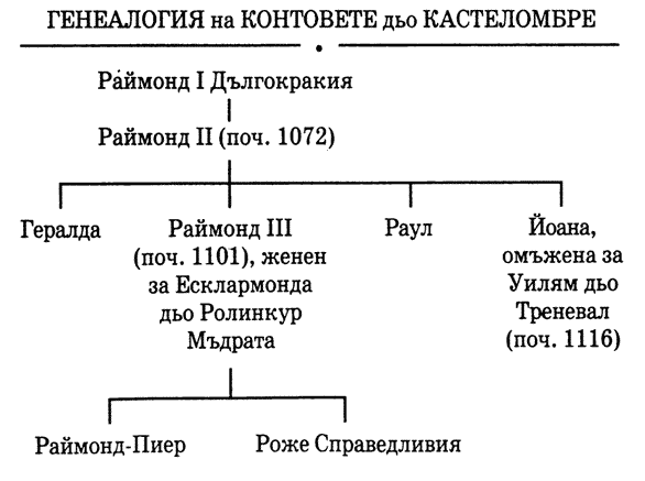 Прочете доклада още веднъж, много внимателно, записа си необходимата информация, запамети сайта в папката за любими сайтове и се върна в „Гугъл“, където изписа в полето за търсене „Кастеломбре“. Излязоха шест сайта. Влезе в първия — „Генеалогия на контовете дьо Кастеломбре“. Екранът дълго време остана черен, след което като от мъгла, разчистена от силен вятър, бавно се материализира фамилно дърво, или по-скоро семеен храст, защото по клоните му като листа бяха закачени повече от дузина имена. Това, което привлече вниманието й, беше точно в средата.
