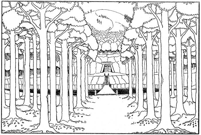 Пътниците вървяха в редица по един. В началото на пътеката имаше нещо като свод, който водеше към тъмен тунел. Сводът бе образуван от преплетените клони на две грамадни, приведени едно към друго дървета. Те бяха толкова стари и така задушени от бръшлян и лишеи, че по тях бяха останали само по няколко почернели листа. Пътеката беше много тясна и лъкатушеше между стволовете.