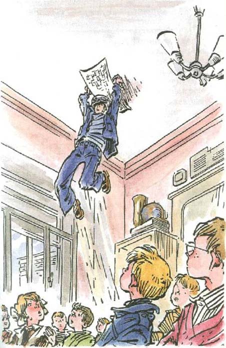 При тези думи Гусев се хвана за а-килимчето и моментално полетя нагоре. В класа чуха как каската му се прасна в бетонната плоча на тавана. Но от Макар — ни вик, ни стон. Виси във въздуха, хванат за килимчето, и пита отгоре: „Е, как ви се струва?“ Хитър изпитател: сложил здрава мотоциклетна каска!