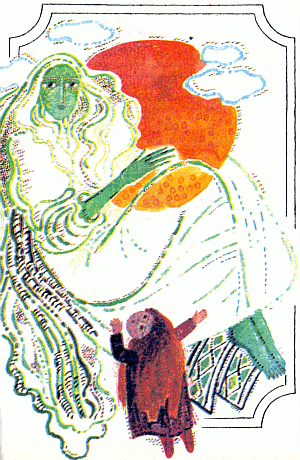 Тогава Роланд продължил пътя си и стигнал до една овощна градина, където стара жена със сиви дрехи хранела птиците. А малките очички на птиците били като малки пламтящи въгленчета и той разбрал, че те са на царя на самодивите и значи той се намира още в страната на самодивите.