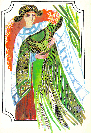 Когато свършила да плете, облякла тръстиковата дреха, която скрила хубавото й облекло, сложила тръстиковата шапка, която скрила хубавата й коса, и заприличала на обикновено селско момиче. А блатните птици, като отлитали, запели: