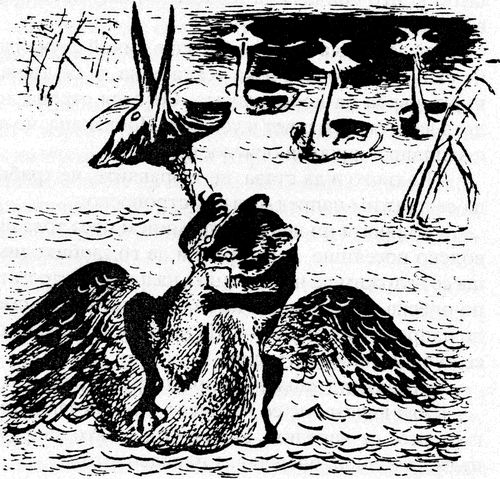 Но птицата дори не го погледна. Тя продължаваше да надава неприятни викове. Явно бе, че няма доверие в нашите пътешественици. На вика й се стичаха все повече гмурци, които гледаха пътниците враждебно с червените си очи.