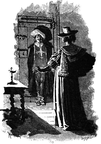 — Господин Атос — каза Ришельо, — приемете моите благодарности за добрата охрана. Господа, стигнахме. Влезте, през вратата вляво, паролата е кралят и Ре.