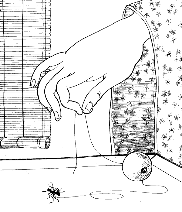 Като усетила мириса на мед, на нея и се приискало да си похапне и бързо влязла в дупката. Тъй като била мъничка, можела съвсем спокойно да премине през прохода, независимо от заплетените му извивки. Не след дълго тя се показала от другата страна и така конеца бил умело нанизан през извития проход.
