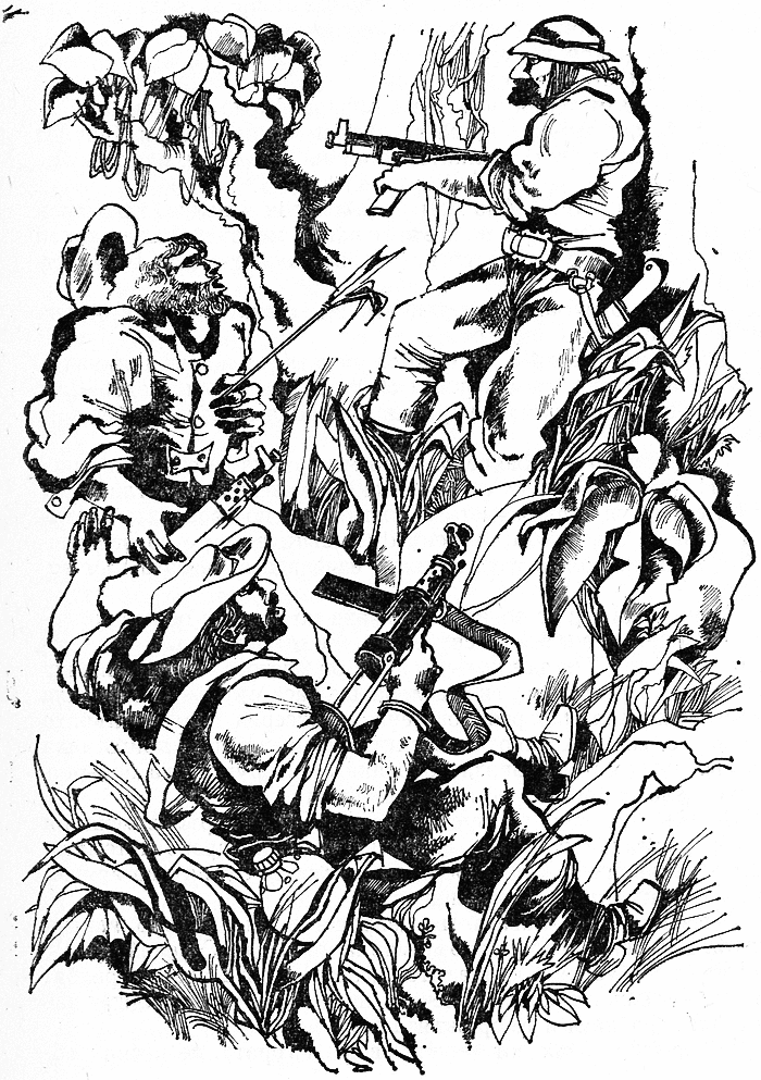Внезапно над главата му изпращя клон. Алваро вдигна цевта. В съзнанието му само се мярна мисълта: „Стреляй пръв!“ И натисна спусъка. Останалите часови откриха честа стрелба. Някакво тежко тяло се свлече с шум надолу. Заспалите наскачаха, грабнаха и те оръжията си.