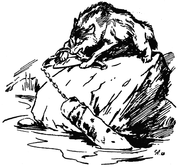 „Сега или никога!“ — помисли си Янко и се върна да вземе капана. Той го извади от кухината на дървото, където беше го крил, и се върна на пътя. С помощта на големия си ловджийски нож издълба гнездо за капана в тинестия бряг. Натисна силните пружини с крак и като си помагаше с ключа, лесно запъна на куката големия, ръждив език. Двете дъги с железни зъби легнаха почти във водата, а самата верига, привързана о капана, Янко прекара под водата и привърза другия й край в едно довлечено от потока дърво. Като покри клюсата със ситни камъчета, тиня и пясък, тъй че тя стана невидима, той се отдръпна на пътя и огледа мястото. Беше доволен от работата си. Тоя път капанът бе заложен много добре: стъпалото бе точно на мястото, където доскоро личаха отпечатъците от предните лапи на сивия, веригата беше скрита под водата и по никакъв начин вълкът не би могъл да усети миризмата на желязото. Ако тая нощ той минеше оттук, положително щеше да се хване.
