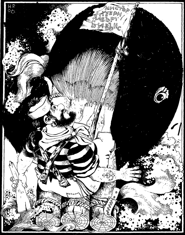 На рисунката се вижда как Китът поглъща Моряка заедно със сала му, моряшкия нож и презрамките, за които не трябва да забравяш. Презрамките са тези кръстосани неща с копчетата, а ножът е до тях. Салът се е наклонил настрани и затуй почти не се вижда. Сивкавото в лявата ръка на Моряка е парче дърво. С него Морякът се е опитвал да гребе, преди да дойде Китът. Парчето е от мачта и по-точно от байфут на гафел[1]. Морякът ще го изпусне, когато Китът почне да затваря устата си. Името на Кита е Смехур. А на Моряка — мистър Хенри Албърт Бивънс. Малката Кротушка-хитрушка се е мушнала под корема на Кита и затова не можах да я нарисувам. А пък водата прави такива въртулки-завъртулки, защото Китът я всмуква в устата си, за да погълне мистър Хенри Албърт Бивънс заедно със сала, ножа и презрамките му. Внимавай да не забравиш за тях!