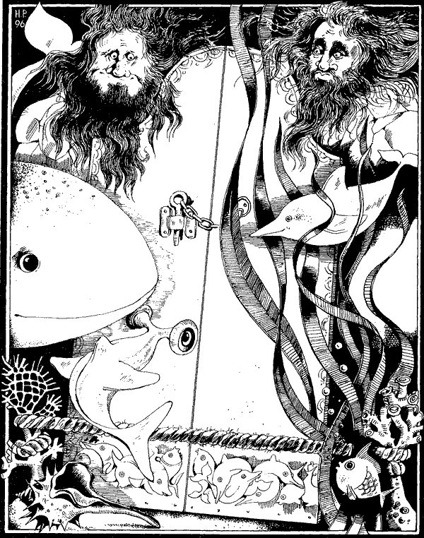 А тук се вижда как Китът търси малката Кротушка-хитрушка, а пък тя се крие под прага на Екватора. Истинското име на рибката е Пинги. Тя се е сгушила в корените на големите водорасли, които се люлеят пред вратите на Екватора. Вратите също се виждат на рисунката. Те са затворени, защото вратите винаги трябва да се затварят. Това, което прилича на въже, опънато по долния им ръб, е самият Екватор, а двете скали отляво и отдясно не са скали, а великаните Моар и Коар, които отговарят за Екватора. Те са нарисували рисунките по вратите и са издялали сплетените риби в долната им част. Рибата с острата муцуна е Клюнест делфин, а другата, дето очите й са встрани, е от семейството на акулите и се нарича Риба чук. Забравих да кажа, че Китът дълго време не можа да намери малката Кротушка-хитрушка, а пък после, когато я откри, вече ядът му беше минал и те отново станаха добри приятели.