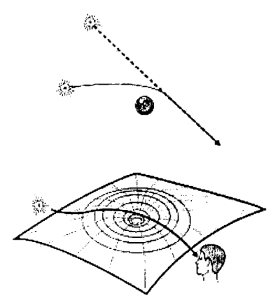 През 1919 г. два екипа потвърдили предположението на Айнщайн, че светлината от далечните звезди се отклонява, когато минава покрай Слънцето. Така изглежда, че в присъствието на Слънцето звездата се е преместила от обичайното си положение. Това се дължи на факта, че Слънцето изкривява пространството и времето около себе си. Следователно гравитацията не „тегли“, а по-скоро пространството „тласка“.