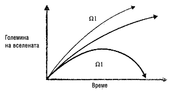 Ако Омега е по-голяма от единица, тогава вселената в крайна сметка ще се свие в себе си. Времето и пространството са крайни. Според Фридман кривината на такава вселена е положителна (подобно на сфера). И накрая, ако Омега е равна на единица, пространството ще е плоско и между него и времето няма да има връзка.