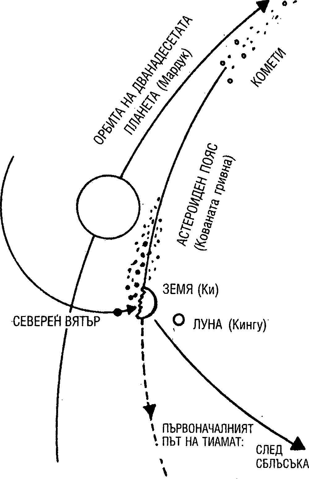 Нещо повече, тук ни се предлага — за пръв път — последователно космогонично-научно обяснение на небесните събития, довели до изчезването на „липсващата планета“ и на образуването на астероидния пояс (плюс кометите) и Земята. След като няколко от сателитите му и неговите електрически мълнии разцепили Тиамат на две, друг спътник на Мардук пратил горната й половина в нова орбита като планетата Земя. По време на следващата си обиколка самият Мардук разбил долната половина на парчета и ги пръснал в голяма небесна лента.