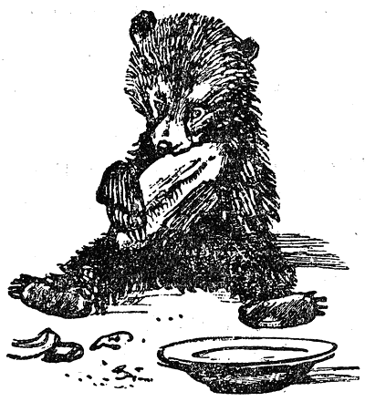 Моите гимназисти му домъкнаха мляко, кифли, сухари. Мечето приемаше всичко като нещо естествено и като седна в ъгъла на задните си лапи, се приготви да закуси. То вършеше всичко с необикновено комична важност.