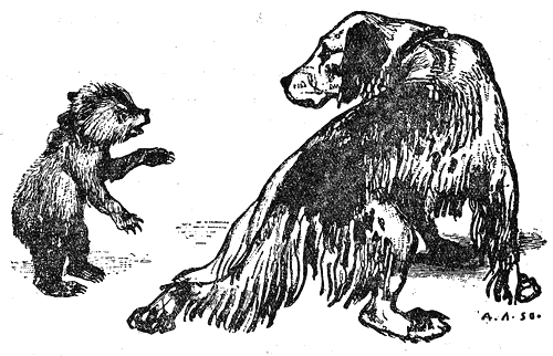 Докато се суетяхме така, в стаята незабелязано влезе моето ловно куче, стар червеникав сетер[1]. Кучето веднага усети присъствието на някакво неизвестно животно, протегна се, наежи се и преди да успеем да се огледаме, то вече направи стойка над мъничкия гостенин. Трябваше да се види картината: мечето се мушна в ъгъла, приклекна на задните си лапички и гледаше с такива зли очички кучето, което бавно пристъпваше.