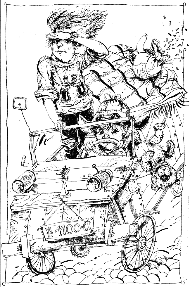 Двамата пускат едновременно писмата си. Сега вече нищо не ги спира. Прас натиска клаксона и завърта педалите. Но изведнъж удря спирачка и се втурва отново вкъщи — да вземе одеяло и по един шал. Някой прекрасен ден току-виж дошла и зимата. Ние стоим встрани и наблюдаваме как дървомобилът се отдалечава.