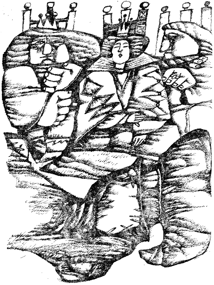 Най-напред изпод скалата зинала с ослепителна светлина просторна пещера. И когато побратимите свикнали със силната светлина, всички видели, че това не било обикновена пещера, а зала с удобства за добър живот… По стените й висели като ледени висулки драгоценни камъни и от тях струела навред сияйната светлина. Подът бил застлан с дебел килим. А в дъното на залата се кипрели две каменни кресла, покрити с топли вълнени китеници. И върху тях занемелите от изненада приятели зърнали тези, които търсели под дърво и камък — коварния съдия и горделивата кметска дъщеря.