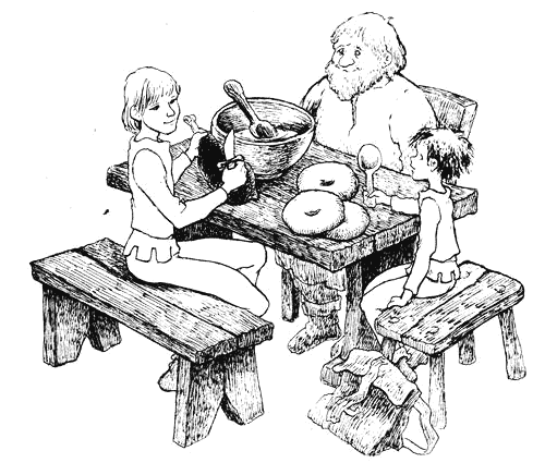 Озърнах се за моята торбичка, спомних си какво носех в нея: когато извадих питките и пушеното овнешко, Йонатан и Матиас се задъхаха, очите им светнаха. Толкова ми беше приятно да им устроя скромен пир: нарязах месото на големи парчета и ние засърбахме чорбата, подлагайки си с хлебец и овнешко. Лапахме, та ушите ни плющяха. Дълго време никой не продума. Но накрая Йонатан се обади: