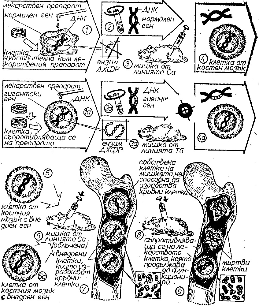 Накрая подложих мишката на постепенно увеличаващи се дози метотрексат и наблюдавах, какво става в костния й мозък. Клетките, които не произвеждаха червени кръвни клетки, бяха унищожени; загинаха и клетките, които съдържаха простия ген. Клетките с гигантския ген останаха резистентни и продължаваха да произвеждат червени кръвни клетки. Това беше и доказателството, че присаждането на гена е успешно.