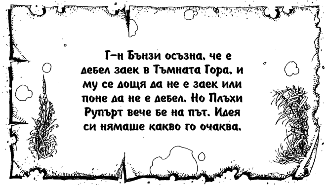 — Той подплаши останалите — промълви Опасна Тиква. — Те просто… спряха да мислят… — Дребният плъх изглеждаше съвсем отчаян. До него, изцапана с прах и следи от лапи, лежеше отворена „Г-н Бънзи има приключение“. — Дори Токсинчо избяга. А той умее да пише! Как е възможно да се случи това?