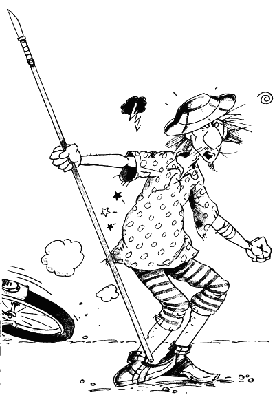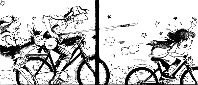 — Бъдете смела! Ще Ви спася! — извика Дон Кихот, скочи на велосипеда и последва Лили.