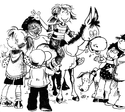 Под възгласите на зрителите, тримата се запътиха към парка. Лили и Дон Кихот бяха на колелетата, а Санчо Панса върху магарето: каква смешна гледка бяха само!