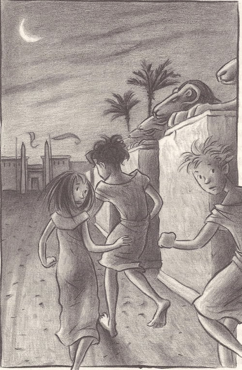 Те попитаха за пътя и още същата вечер тръгнаха към светилищата. По алея от сфинксове[1] с глави на овни те се озоваха при стените, които ограждаха храма на богинята Мут[2]. Зад тях бяха свещеното езеро и храмът със златната обител на богинята. Но вратите на храма останаха здраво заключени за незначителните кухненски помощници. Стражата не ги допусна вътре. Същото се случи в съседния, много по-голям храм на Амон. Ким, Юлиан и Леон спряха възхитени пред внушителните обелиски и 65-метровите пилони, подобни на двойни кули, от двете страни на каменната врата. Повърхността им беше украсена с релефи на религиозни или бойни сцени. Мачти с веещи се на вятъра знамена стърчаха над пилоните. Но и този храм не беше предназначен за простолюдието. Единствено жреците и фараонката имаха достъп до покоите на божеството. Разочаровани, децата изтичаха към третото светилище, посветено на сина на Амон и Мут, бог Хонсу[3]. Но стражите просто им се изсмяха.