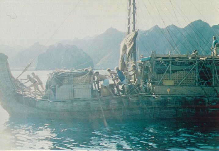 В Бахрейн бяхме пристигнали с голям пробив във вълнореза. Над водолинията почти нищо не се виждаше, но Герман излезе ужасѐн след гмуркането си под водата и ни съобщи, че в дупката имало място, колкото да се пъхне човек. Въжетата не бяха скъсани, висяха, както са си на примки, и вътрешните снопи бяха оголени. Трябваше да запълним отвора, иначе нищо не бе в състояние да предотврати непрекъснатото разнищване на тръстиката, додето накрай и целият кораб се разпадне.