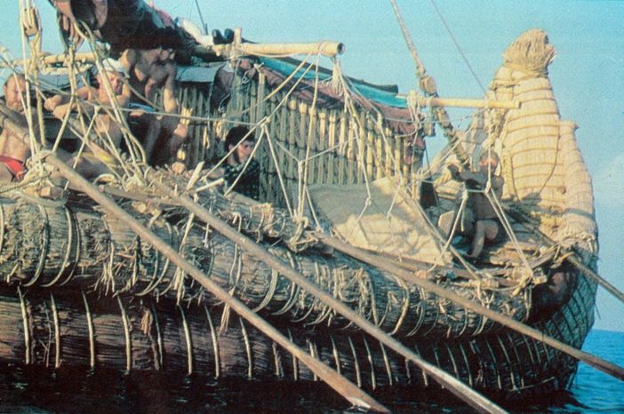 Напрежението върху всички части на нашата ладия будеше уплаха. Ужасяващо скърцане, пращене и други разяждащи звуци долитаха от въжетата, дървенията, бамбука и тръстиката. Огромните вретена на кърмовите гребла така силно тропаха и се блъскаха насам-натам в своите вилки, че буквално разтърсваха целия кораб и движението им се усещаше като истински удари с чук по дървените сандъци, върху които спяхме. По едно време двамата с Детлеф станахме и в тъмнината вързахме вретената в неподвижно положение. След това ужасяващото чукане престана.