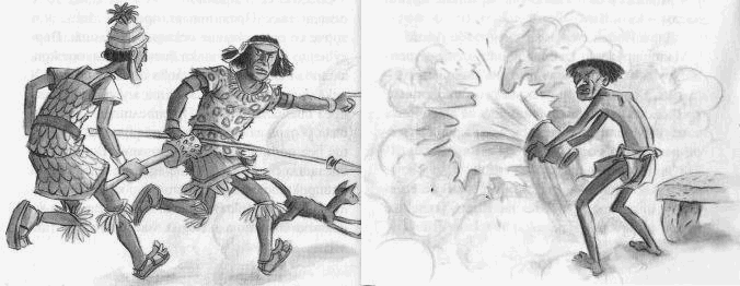 Войниците се втурнаха към вратата. Приятелите ги последваха и видяха как една фигура с кожена препаска прекоси тичешком големия площад пред теокали. Само че Кцимал нямаше къде да избяга. Войниците го настигнаха и го повалиха. След това довлякоха яростно съпротивляващия се жрец при най-долното стъпало на пирамидата.