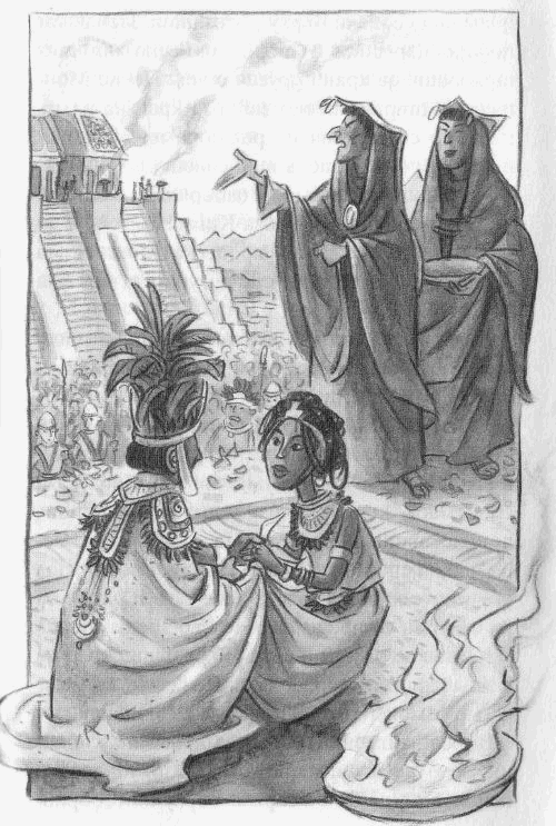 Барабаните замлъкнаха и се разнесе силно дрънчене от множество кратунки. Към него се присъединиха високите звуци на флейти и звънчета. Под този съпровод процесията стигна до подиума. Няколко слуги помогнаха на Неца и Актлу да слязат от носилката. Неца беше облечена в бледосиня рокля със златен колан. На ръцете й светеха пръстени, а високо вдигнатата й коса блестеше. Ким предположи, че в косата на булката са вплетени скъпоценни камъни. Баща й беше як мъж, загърнат в наметало, падащо на вълни. И той носеше корона от пера, която обаче съвсем не беше толкова разкошна, като тази на Монтесума.