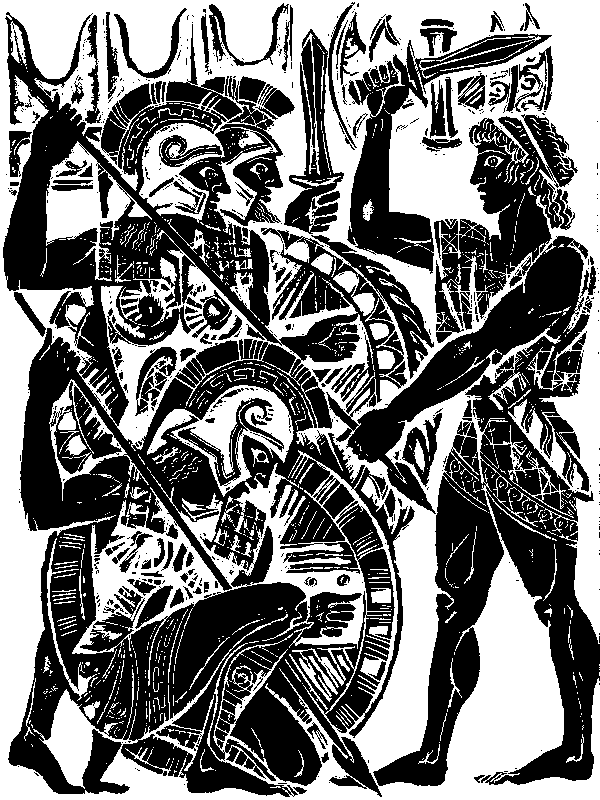 И веднага от коридорите на двореца изскочиха през вратите му пет-шест стражи с двувърхи копия.