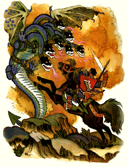 Добриня изскочил на стръмния бряг и през дима видял: ламята стои на четирите си лапи, с криле дращи по земята, протяга към Добриня седем глави. Страшно страшилище! Цялото в студени люспи. Устните на ламята лакоми, зъбите й остри като железни гвоздеи.