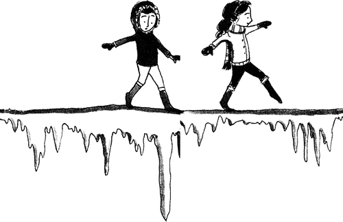 Всъщност беше ужасно. Леденият мост бе хлъзгав. Замръзналата му повърхност бе покрита с тънък, подобен на посипана захар слой сняг, и нямаше нищо, което да попречи на момичетата да се плъзнат и да паднат в зейналата пропаст отдолу. Сезам бавно местеше единия си крак пред другия, като опитваше здравината на леда при всяка крачка. Скръц, скръц, скръц! „Ами ако се пропука — помисли тя. — Не! Недей да мислиш!“ Мади вървеше плътно зад нея. От време на време Сезам я чуваше как хлипа. Горката, колко ли беше уплашена!