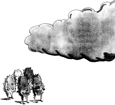 Бодливците с тревога гледаха приближаването на зловещия черен облак. Стояха скупчени на групички. Всеки бодливец беше висок около четири лога[1] — горе-долу колкото средно голям трол. Издутите им зелени тела бяха покрити с бодли и всяка групичка приличаше на чепка френско грозде.