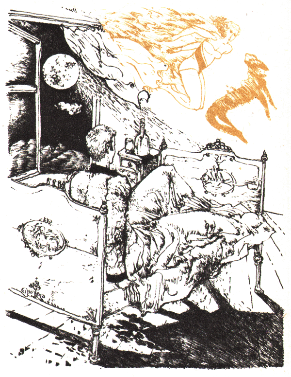 Лекото нетърпеливо пристъпване на краката още по-рязко показваше гъвкавото движение на мускулите на гостенката ми. Никога не съм мислил, че халюцинацията може да се яви в толкова прелестен образ! Без да се съмнявам ни най-малко в произхода му, аз все пак притиснах клепачите на очите си заради чистотата на опита. Но, уви, треската от грипа беше изтрила напълно от паметта ми, кое точно трябваше да се раздвои — видението или реалните предмети? Освен това, което беше вече съвсем непростимо, аз се престарах с натискането и за момент съвсем ослепях. А когато зрението ми се възстанови, вече нямаше никакво раздвояване никъде. Бялото око на луната гледаше през прозореца както и по-рано, нищо не се беше променило в стаята освен позата на девойката. Привела се като за скок, опънала назад тънките си лакти, тя бавно се приближаваше към мен. Стъпките й бяха беззвучни и меки, очите гледаха някъде над кревата, отчетливо виждах всяка гънка на окъпаното в лунната светлина тяло на девойката и в нея нямаше нищо нереално, освен…
