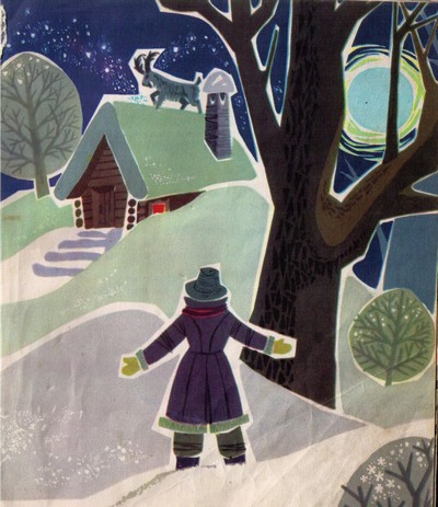 Нощта била лунна, светла, надалеко се виждало. Гледа Дарьонка — котката седи наблизо, на полянката, а срещу нея — козелът. Вдигнал си крачето, а на него сребърно копитце блести.