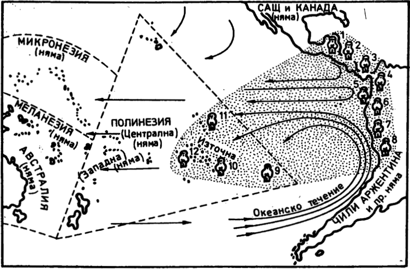— Разбира се, че е възможно. Само че в едната посока е хиляди пъти по-лесно, отколкото в другата. Погледни и нашите ранни изследователи. Докато не била открита Америка, никой не успял да стигне до тихоокеанските острови. Европейците останали дълго време в Индонезия и по бреговете на Азия, но никой кораб не се опитал да навлезе в открития Тихи океан срещу вятъра и течението. Едва след като Колумб ги отвел в Америка, португалците и испанците продължили оттам с вятъра и течението в гърба си и открили целия обширен Тихи океан, Полинезия и Меланезия са открити от испанци, които, следвайки съвета на мореплаватели инки, тръгнали от Перу по течението. Дори ония, които са открили Микронезия, включително Палаус и други острови край самия бряг на Азия, са тръгнали от Южна Америка. Една подир друга експедициите се впускали в Тихия океан, но всички от Америка, нито една от Азия. Корабите от онова време дори не били в състояние да се върнат по същия път, по който прекосили Тихия океан. В течение на две столетия каравелите сновали по тропическия пояс на Тихия океан от Мексико и Перу на запад до бреговете на Азия, но за да се върнат в Америка, трябвало да тръгнат на север с японското течение и да пресекат Тихия океан далеч на север от Хавай, където няма никакви острови. Не трябва да очакваме от малайските канута или от балсовите салове и тръстиковите лодки на инките повече, отколкото от европейските каравели. Помниш ли французина Дьо Бишоп, който беше готов да тръгне със своя бамбуков сал, когато се отбихме в Таити? Веднъж се опитал да преплава Тихия океан от Азия до Полинезия с първобитен плавателен съд. Но не успял. След това опитал в обратна посока — от Полинезия към Азия. Успял, и то с лудешка бързина. Сега се опитва да преплава със сал от Полинезия до Америка. Той ще трябва да се спусне далеч на юг към студеното Антарктическо течение, което се движи на изток. Като европеец, може би ще изтърпи тамошните ледени бури. Но ако изобщо стигне благополучно на неколкостотин мили от южноамериканския бряг, едва тогава ще започнат най-големите трудности, тъй като движещото се на изток течение там изведнъж завива на север. Ако не успее да преодолее течението, ще се понесе обратно към Полинезия по същия път, който измина салът Кон-Тики и един самотен американец със сал, тръгнал подире ни. Едно е да пътуваш с параход, друго е да пътуваш с молив по картата, а съвсем друго е да пътуваш с първобитен плавателен съд по неспокойния океан.[3]