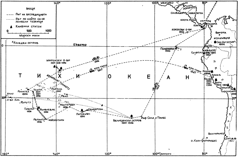За хиляден път се наведох над писалищната маса и погледът ми се плъзна по едромащабната карта на Тихия океан — този предателски лист хартия, на който островите изпъкват, означени с главни букви, и с чертожната линия се пътува еднакво лесно по и срещу теченията. Бях вече почнал да опознавам този океан. Там, в дивите долини на Маркизките острови, точно на юг от екватора, живях цяла година по туземски и се научих да виждам природата с очите на полинезийците. Там чух за пръв път разказите на стария Тей-Тетуа за човека бог Тики. По на юг от Дружествените острови, сред палмите на Таити, великият главатар Терииероо някога бе мой учител. Той ме осинови и ме научи да уважавам неговата раса като моята собствена. А там, на кораловия риф в архипелага Туамоту, достигнахме суша със сала „Кон-Тики“ и разбрахме, че дори и соленият океан има свое неумолимо закономерно движение — пътя от Южна Америка до тези далечни острови. Колкото и усамотени да бяха островите, те всички попадаха в естествения обсег на древните балсови салове на индианците инки.