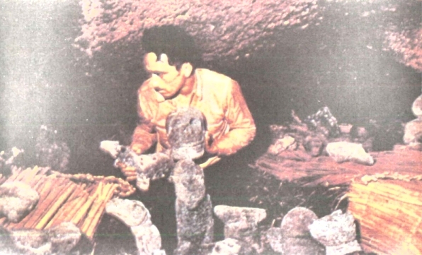 Най-напред не можах да различа нищо освен ужасно тесен ход и в дъното някаква бледа светлина. Дълго време лежах над пропастта, ритайки с крака, а когато най-сетне вмъкнах и ходилата си, усетих, че проходът мъничко се разшири, но таванът си остана нисък. Започнах да различавам около себе си разни очертания, а после открих до ухото си една скулптура, представляваща две галещи се гургулици. От другата ми страна се появи малка статуетка от същия тип като великаните от Рано Рараку. Проврях се по-навътре и ходът се разшири: след малко можах да седна и да се огледам в пещерата, в която от някаква невидима дупка проникваше светлина. Покрай стените върху самата суха скала стояха или лежаха гъсти редици странни скулптури. Тук нямаше рогозки, нито пък сено. На няколко метра пред мене пътят беше препречен от голяма фигура, несъмнено от мъжки пол. Тя стоеше с разкрачени крака, прегънати колене и заплашително издигнати ръце и беше обкръжена от множество други фигури. Зад нея имаше малко стъпалце и на по-ниската плоскост лежаха два човешки скелета. Малка дупчица в дясната стена пропускаше бледа светлина върху разпадащите се кости и осветяваше смътно очертанията на призрачната съкровищница. Изведнъж чух някакво дихание. Чух го така ясно, сякаш някой дишаше в ъгъла до мене. Това беше Ласарус, който се промъкваше през тесния отвор. Акустиката беше невероятна: чувах дори как кожата му се търка в острата лава. Ласарус влезе, без да извърши някаква церемония, и клекна до мен. Големите му очи и зъбите му се белееха в тъмнината. Беше си пак такъв, какъвто го знаех от нощните му посещения в палатката. Той посочи голямата фигура с разкрачените крака и застрашително вдигнатите ръце, която стърчеше над другите, тя напомняше за регулировчик на движението, който управлява всичките тайнствени фигури, застанали около него и покрай стените на пещерата чак до изхода.