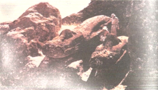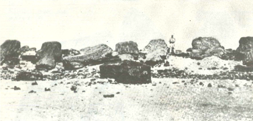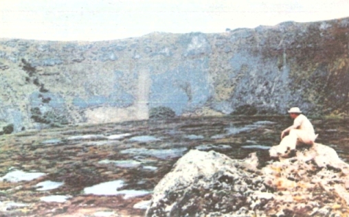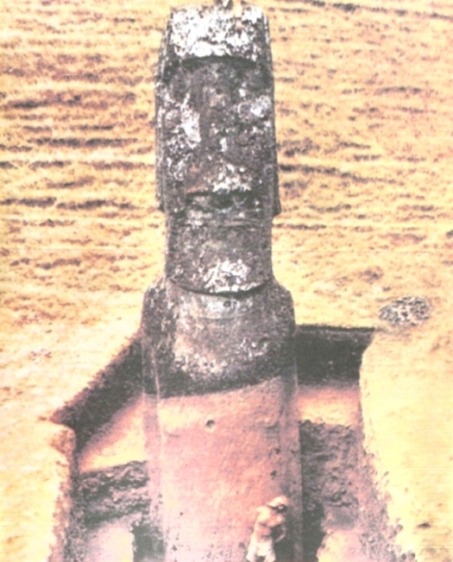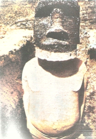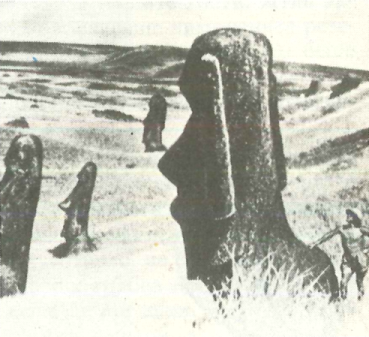 След това минахме край една самотна статуя, която навремето била изоставена, когато я пренасяли към нейното аху на северния бряг. Мислех с удивление за проблема, който представлява транспортът на такава статуя. От мястото, където лежеше тя, до Рано Рараку имаше единадесет километра по права линия, а в тази хълмиста местност, където дори и язденето понякога беше трудно, разстоянието всъщност беше много по-голямо. Тук напуснахме древния път и продължихме през дива камениста равнина по ръба на пропастта над морето. Безкрайният океан беше все още покрит с вълни с бели гребени. Докато се спускахме по стръмното корито на едно пресъхнало поточе, един от ремъците на стремената ми се скъса, но успях да го прикрия, за да не би Ласарус да забележи нещо, и продължих да яздя с едно стреме по насечения терен, който ставаше все по-непроходим и по-непроходим.