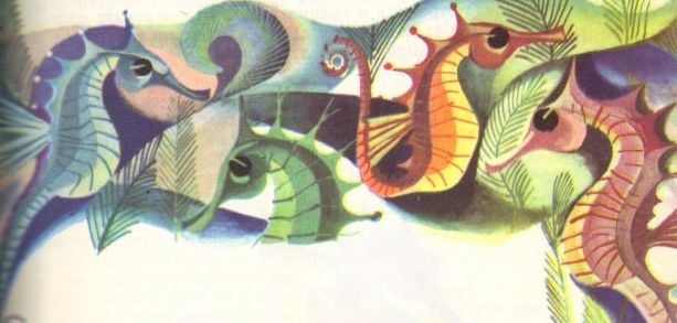 А златните рибки размахваха златните си мънички опашчици и се носеха все напред и напред. Те се спускаха ниско над сините пясъчни морски пустини, смело се провираха през гъстите морски червени гори, безстрашно надничаха в черните подводни пещери и търсеха, и търсеха, и търсеха морските кончета.