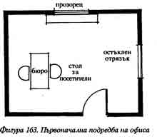 Нека оставим настрана управленческите умения на Джон и да съсредоточим вниманието си върху несловесните аспекти на проблема. Ето накратко до какви изводи стигнахме относно подредбата на офиса на Джон (фигура 163):