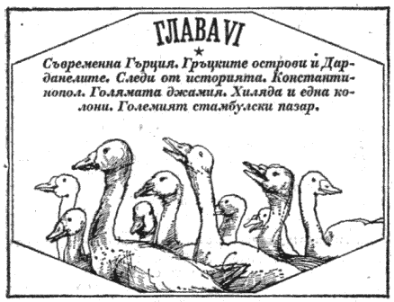 По целия път от Атина през Гръцките острови видяхме само заплашителни диги край морето и голи хълмове, над които понякога се извисяват по три-четири изящни колони от някой древен храм, самотни и изоставени — подходящ символ на разрухата, обхванала цяла Гърция през последните векове. Не видяхме нито разорани ниви, нито дървета, нито трева или някаква растителност — само тук-таме селца, а още по-рядко някоя самотна къща. Гърция е мрачна безрадостна пустиня и там очевидно няма нито селско стопанство, нито промишленост, нито търговия. С какво се издържат бедният й народ и правителството й е просто загадка.