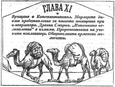 Когато минавахме през Дарданелите, зърнахме с бинокли камилски кервани, но чак в Смирна видяхме такъв керван отблизо. Тези камили са много по-големи от мършавите екземпляри, които могат да се видят в зоологическата градина. Те крачат по улиците в индийска нишка — дузина камили в керван, с тежки товари на гърба, — а отпреде язди на магаренце някакъв негър в живописна турска носия, или пък арабин, който изглежда незначителен в сравнение с тези огромни животни. Керван камили, натоварени с подправките на Арабия и с редките тъкани на Персия, минаващ през тесните улички на пазара сред хамалите, сарафите, търговците на фенери, търговците на стъклария, внушителните турци, седнали по турски и пушещи прочутото наргиле, и носещите се насам-натам тълпи в чудновати източни носии — това е истинското лице на Ориента. В картината не липсва нищо. Тя веднага те връща в забравените момчешки години и ти отново мечтаеш над чудесата от „Хиляда и една нощ“, отново приятелите ти са принцове, господар ти е халифът Харун Ал Рашид и слугите ти са ужасни великани и джинове, които идват с дим, гръм и мълнии и си отиват като ураган!